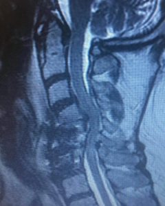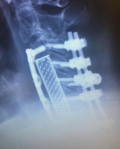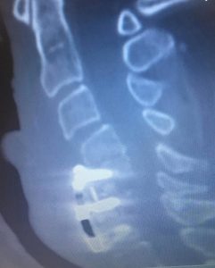 Here is an extreme example of a patient who came to me for correction of a previous attempt at surgery which failed to correct her severe Kyphosis and spinal cord compression. After the much more extensive surgery that I performed, she began to recover strength in her arms again and her ability to walk improved.