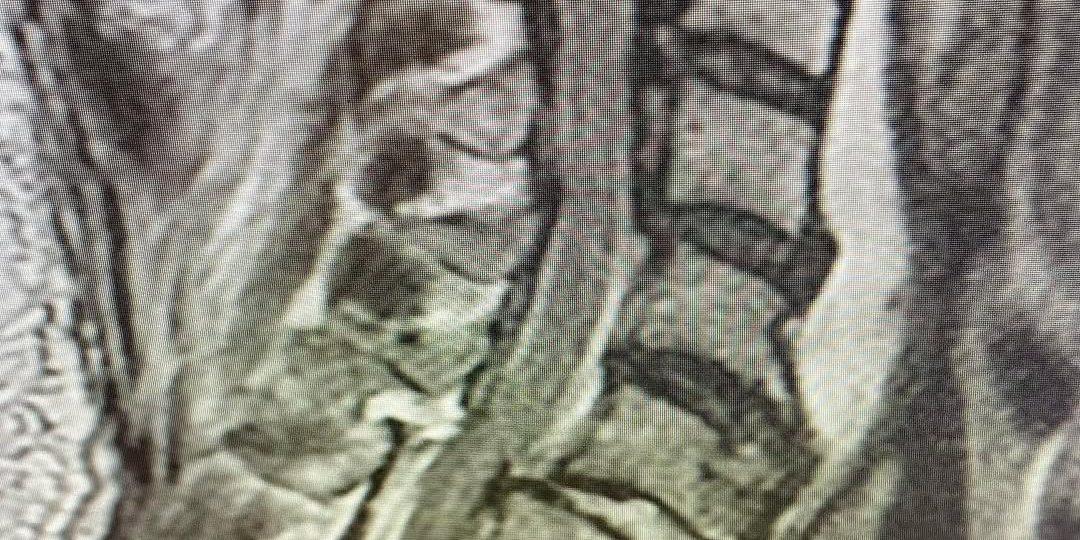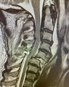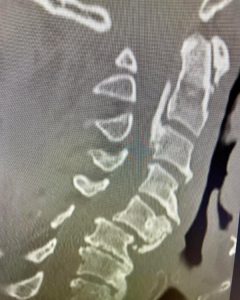 Here is an example of another cervical spine case: MRI and CT scans show a 54 year-old male who had a cervical fracture dislocation at C5-6 after diving forward into shallow water and striking his head. He was fortunate not to be paralyzed. The patient also had chronic conditions in his cervical spine that put him at even higher risk. He had severe cervical stenosis, or narrowing of the spinal canal. He also had a somewhat rare condition called OPLL or ossification of the posterior longitudinal ligament.