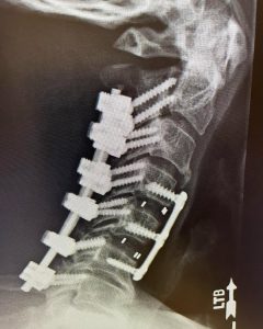 Surgery was be performed to take the pressure off the spinal cord and then realign his spine and stabilize it with both an anterior plate and screws and posterior screws and rods. The final x-ray as a postoperative picture. He did well after surgery and made a complete recovery with a return to normal activities.