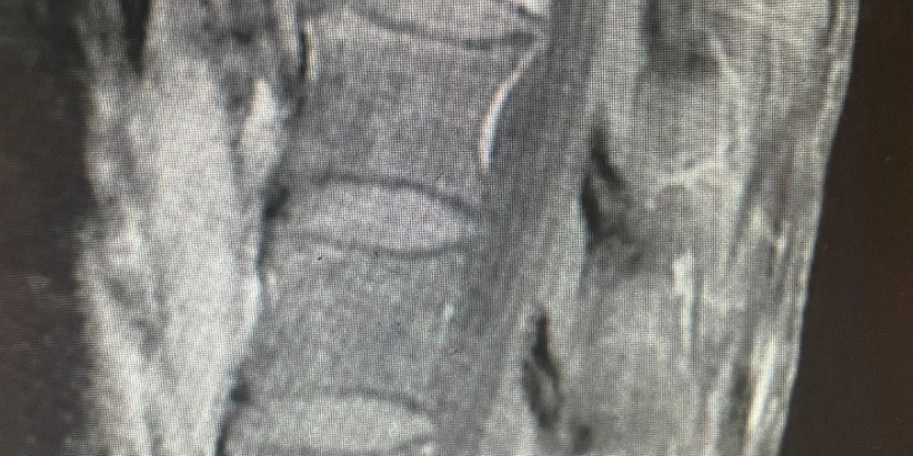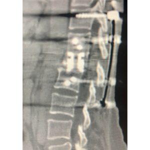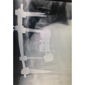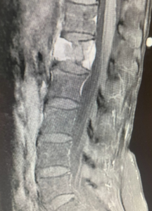 She presented with back pain and Leiomyosarcoma which had spread to the L1 vertebral body. Radiation treatments and cement injection to L1 were tried by the oncologists but her vertebrae collapsed anyway. The first 2 MRI pictures show the progressive collapse.
